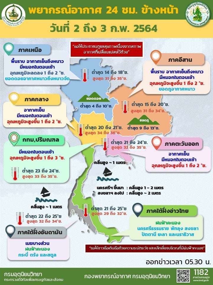 พยากรณ์อากาศ 2 ก.พ. 64 – กรมอุตุนิยมวิทยา รายงานลักษณะอากาศทั่วไป ประจำวันที่ 2 กุมภาพันธ์ 2564 พยากรณ์อากาศ 24 ชั่วโมงข้างหน้า บริเวณความกดอากาศสูงหรือมวลอากาศเย็นที่ปกคลุมภาคตะวันออกเฉียงเหนือ ภาคกลาง ภาคตะวันออก รวมทั้งกรุงเทพมหานครและปริมณฑล มีกำลังอ่อนลง ทำให้บริเวณดังกล่าวมีอุณหภูมิสูงขึ้น 1-3 องศาเซลเซียส แต่ยังคงมีอากาศเย็นกับมีหมอกในตอนเช้า
