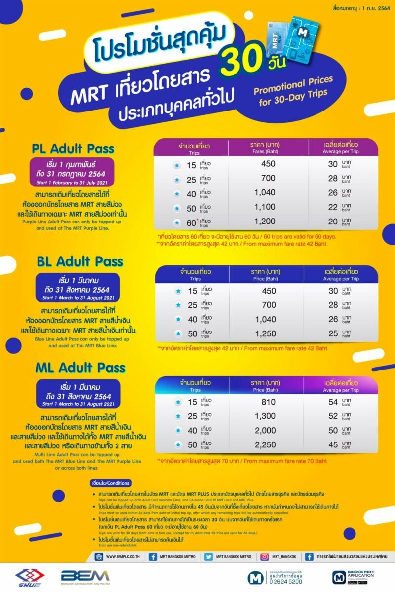 การรถไฟฟ้าขนส่งมวลชนแห่งประเทศไทย (รฟม.) ร่วมกับ บริษัท ทางด่วนและรถไฟฟ้ากรุงเทพ จำกัด (มหาชน) (BEM) ร่วมสนับสนุนนโยบายภาครัฐในการลดภาระค่าครองชีพให้แก่ประชาชน จัด โปรโมชั่น เที่ยวโดยสาร 30 วัน เดินทางในระบบรถไฟฟ้า MRT สายสีม่วง และ MRT สายสีน้ำเงิน ได้ไม่จำกัดระยะทางในราคาประหยัด