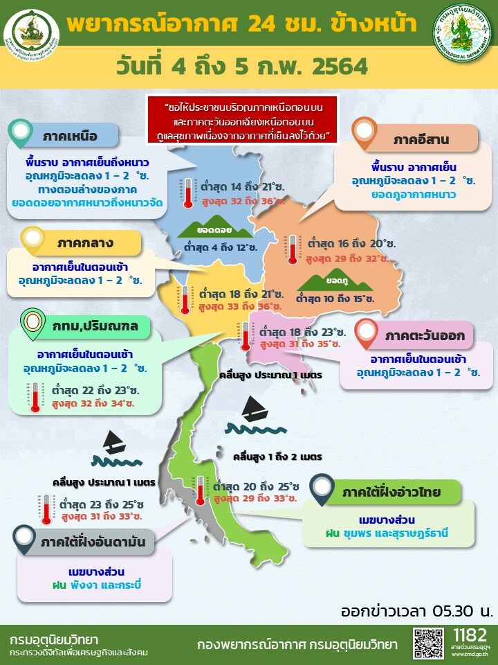 พยากรณ์อากาศวันนี้ พยากรณ์อากาศ 4 ก.พ. 64 อุณหภูมิลดลงทั่วประเทศ ภาคใต้มีฝนตก