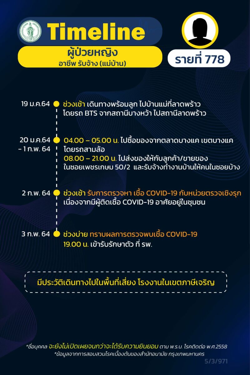 โฆษกกรุงเทพมหานคร เปิดเผย ไทม์ไลน์ ผู้ป่วยโควิด-19 รายที่ 777-782 ระบาดระลอกใหม่ ใน กรุงเทพ โดยอยู่ในเขตบางแคและภาษีเจริญ
