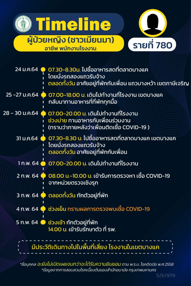 ร.ต.อ.พงศกร ขวัญเมือง โฆษกกรุงเทพมหานคร อัพเดตสถานการณ์การระบาดของโควิด-19 ใน กรุงเทพ โดยเปิดเผย ไทม์ไลน์ ผู้ป่วยโควิด-19 รายที่ 777-782 ระบาดระลอกใหม่ โดยพื้นที่การเดินทางอยู่ในเขตบางแคและภาษีเจริญ