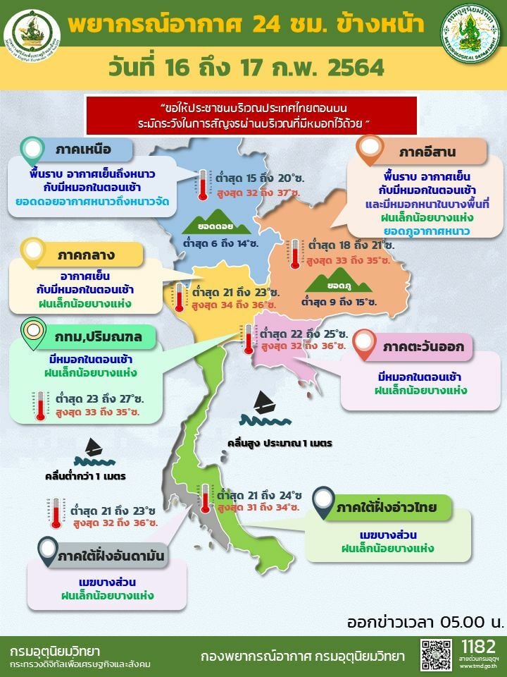 พยากรณ์อากาศวันนี้ พยากรณ์อากาศ 16 ก.พ. 64 ฝนตกเล็กน้อยทั่วประเทศ