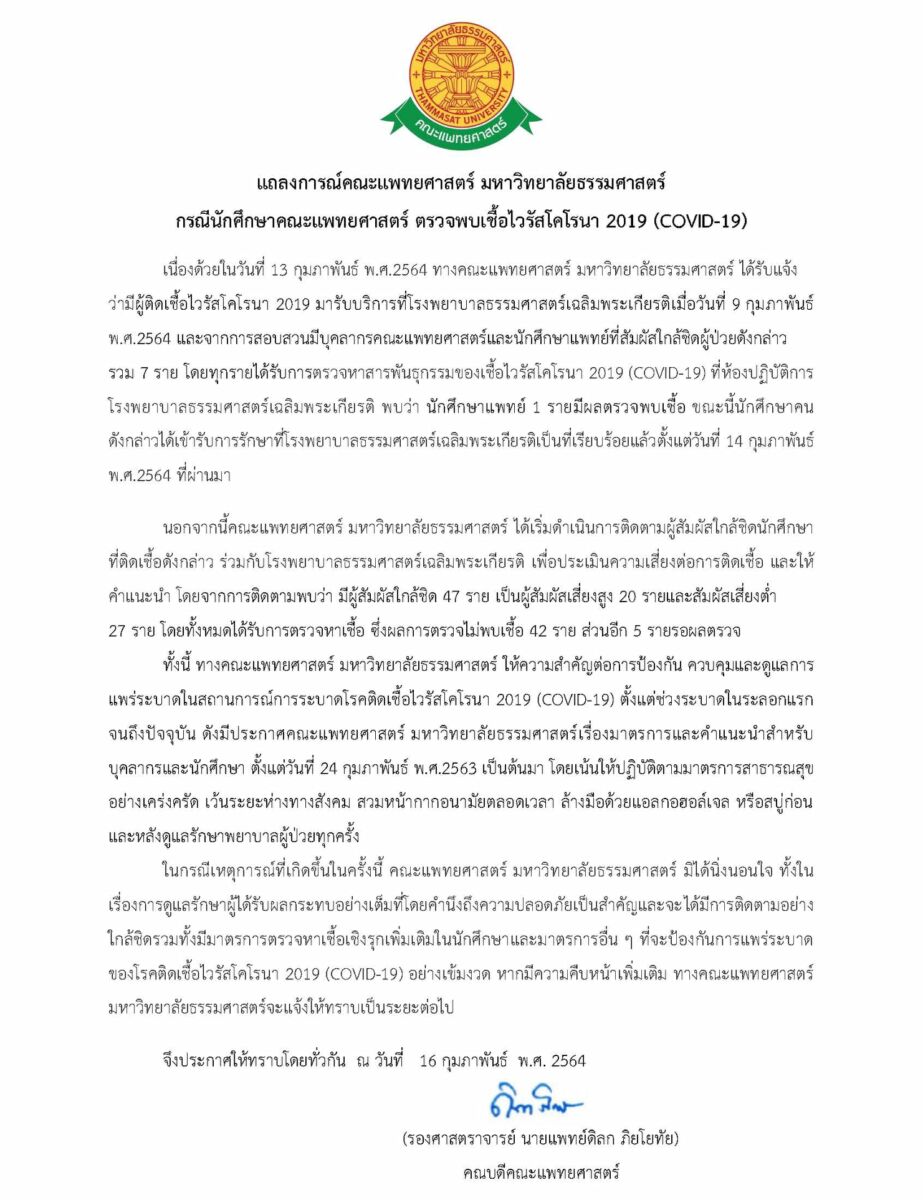 เนื่องด้วยในวันที่ 13 ก.พ. 2564 ทางคณะแพทยศาสตร์ มหาวิทยาลัยธรรมศาสตร์ ได้รับแจ้งว่ามีผู้ติดเชื้อไวรัสโคโรนา 2019 มารับบริการที่โรงพยาบาลธรรมศาสตร์เฉลิมพระเกียรติ เมื่อวันที่ 9 กุมภาพันธ์ พ.ศ.2564 และจากการสอบสวนมีบุคลากรคณะแพทยศาสตร์ และนักศึกษาแพทย์ที่สัมผัสใกล้ชิดผู้ป่วยดังกล่าวรวม 7 ราย