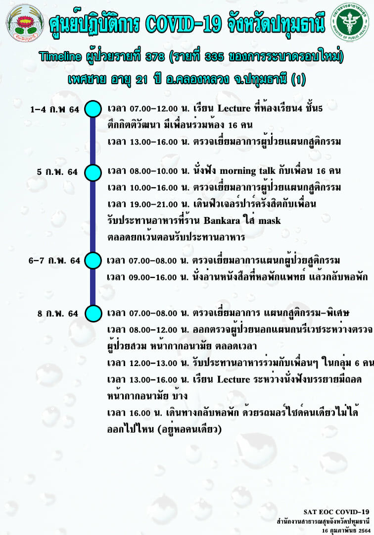 สำนักงานสาธารณสุขจังหวัด ปทุมธานี เปิดเผย ไทม์ไลน์ นักศึกษาแพทย์มธติดโควิด ซึ่งถือเป็นรายที่ 335 ของการระบาดรอบใหม่