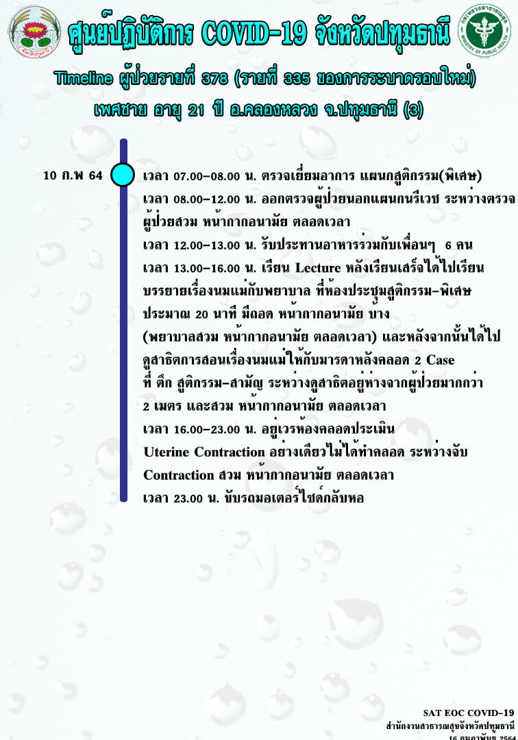 สำนักงานสาธารณสุขจังหวัด ปทุมธานี เปิดเผย ไทม์ไลน์ นักศึกษาแพทย์มธติดโควิด ซึ่งถือเป็นรายที่ 335 ของการระบาดรอบใหม่