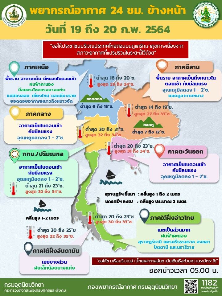 พยากรณ์อากาศ 19 ก.พ. 64 – กรมอุตุนิยมวิทยา รายงานลักษณะอากาศทั่วไป ประจำวันที่ 19 กุมภาพันธ์ 2564 พยากรณ์อากาศ 24 ชั่วโมงข้างหน้า ภาคตะวันออกเฉียงเหนือมีอากาศเย็นถึงหนาว ส่วนภาคอื่น ๆ มีอากาศเย็นโดยทั่วไป กับมีลมแรง และอุณหภูมิจะลดลง 1-2 องศาเซลเซียส สำหรับบริเวณยอดดอยและยอดภูมีอากาศหนาวถึงหนาวจัด เนื่องจากบริเวณความกดอากาศสูงหรือมวลอากาศเย็นกำลังปานกลางจากประเทศจีนยังคงแผ่ปกคลุมภาคตะวันออกเฉียงเหนือ ภาคตะวันออก ภาคกลางของประเทศไทย และทะเลจีนใต้