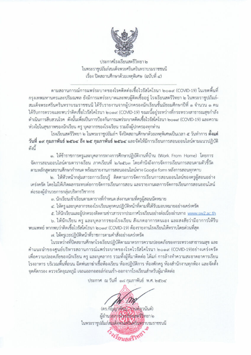 สตรีวิทยา 2 สั่งปิดโรงเรียน ตั้งแต่วันที่ 19-25 ก.พ. และให้ทำการเรียนออนไลน์ หลังพบผู้ปกครองของนักเรียนม.1 ติด โควิด-19
