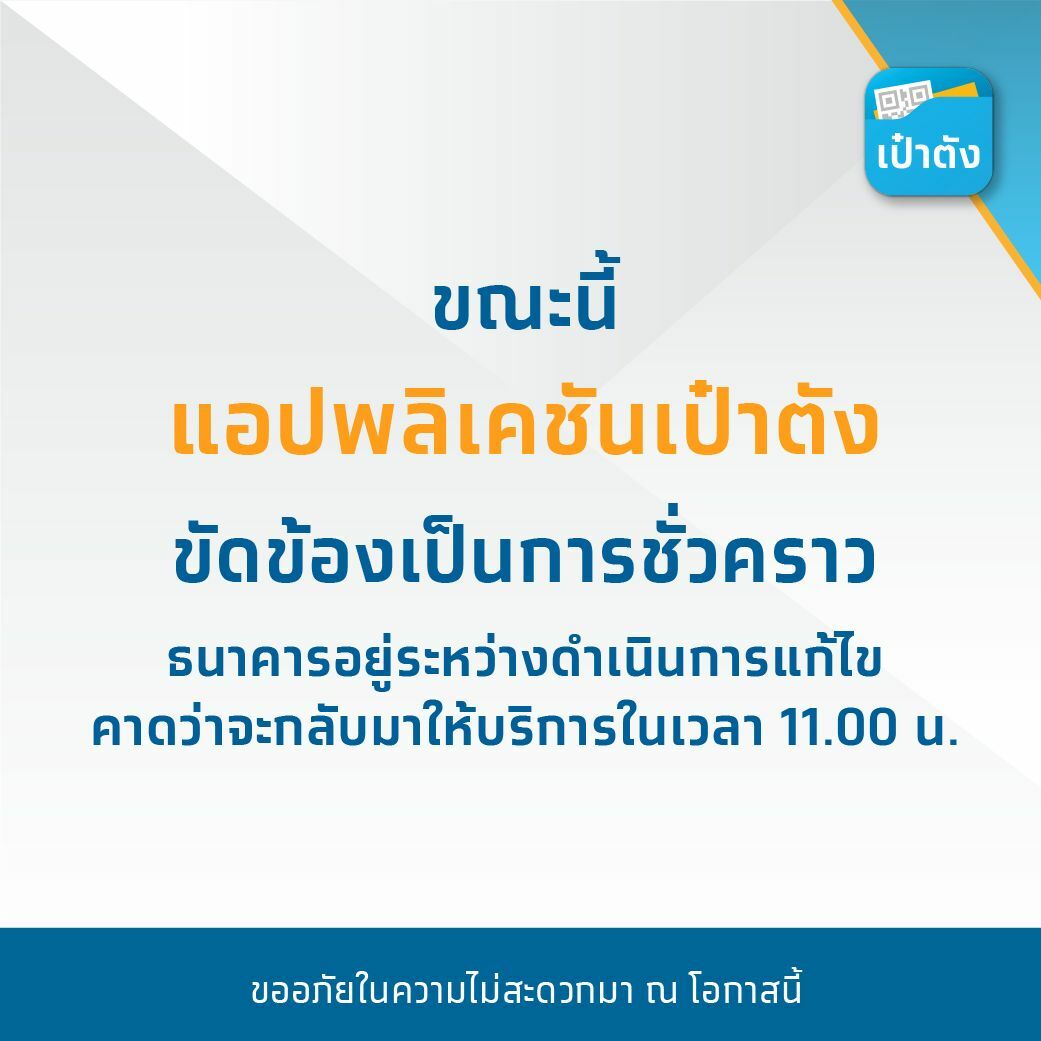 คืบหน้ากรณี Krungthai Care ของธนาคารกรุงไทย ระบุว่า ขณะนี้แอพพลิเคชั่นเป๋าตัง ขัดข้องเป็นการชั่วคราว โดยธนาคารอยู่ระหว่างเร่งดำเนินการแก้ไข คาดว่าจะกลับมาให้บริการในเวลา 11.00 น. ขออภัยในความไม่สะดวกมา ณ โอกาสนี้