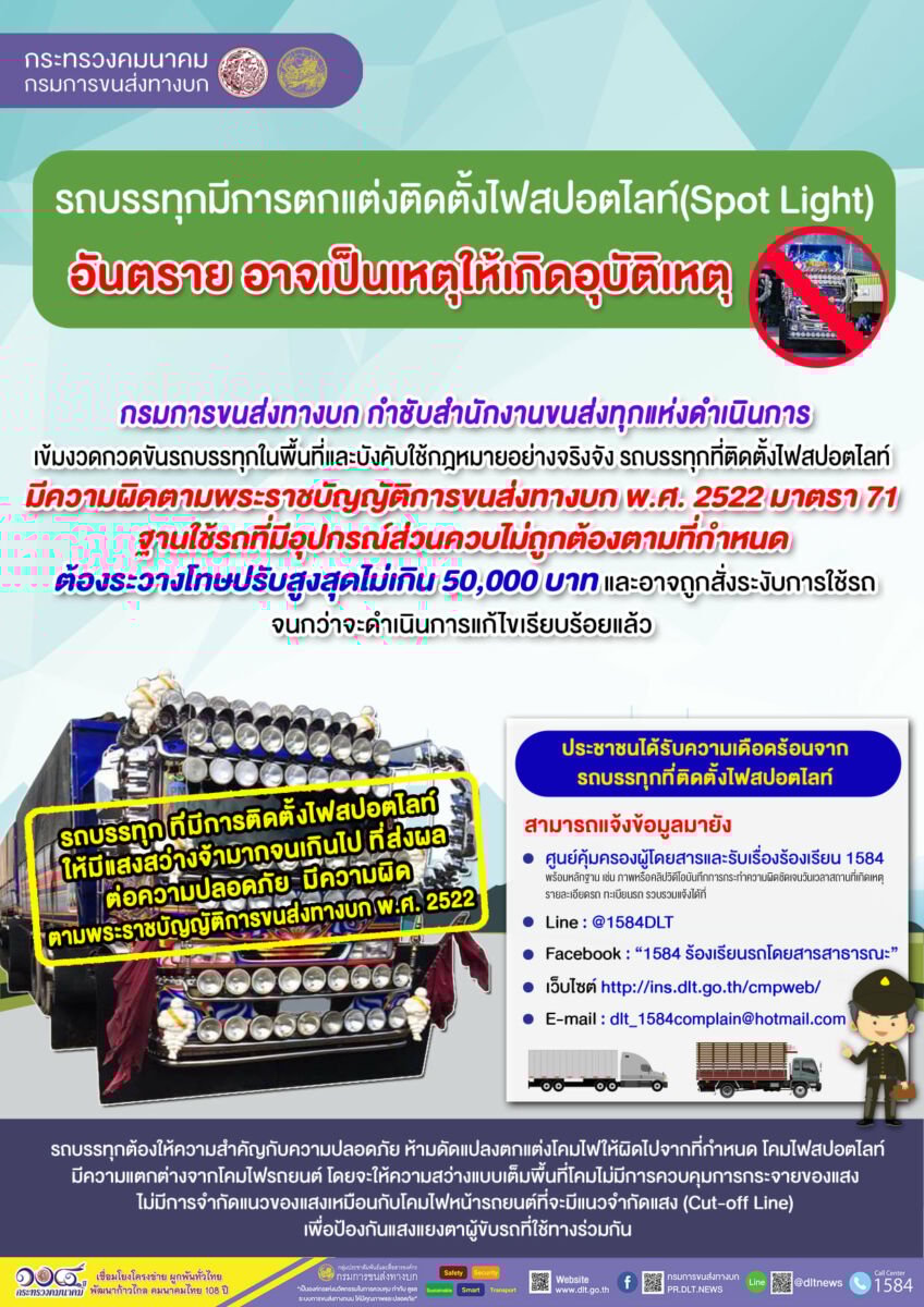 นอกจากนี้ กรณีประชาชนได้รับความเดือดร้อนจากรถบรรทุกที่ติดตั้งไฟสปอตไลท์ สามารถแจ้งข้อมูลมายังศูนย์คุ้มครองผู้โดยสารและรับเรื่องร้องเรียน 1584 พร้อมหลักฐาน เช่น ภาพหรือคลิปวิดีโอบันทึกการกระทำความผิดชัดเจน วันเวลา สถานที่เกิดเหตุ รายละเอียดรถ ทะเบียนรถ รวบรวมแจ้งได้ที่ Line : @1584DLT, Facebook : “1584 ร้องเรียนรถโดยสารสาธารณะ” เว็บไซต์ http://ins.dlt.go.th/cmpweb/, E-mail: dlt_1584complain@hotmail.com