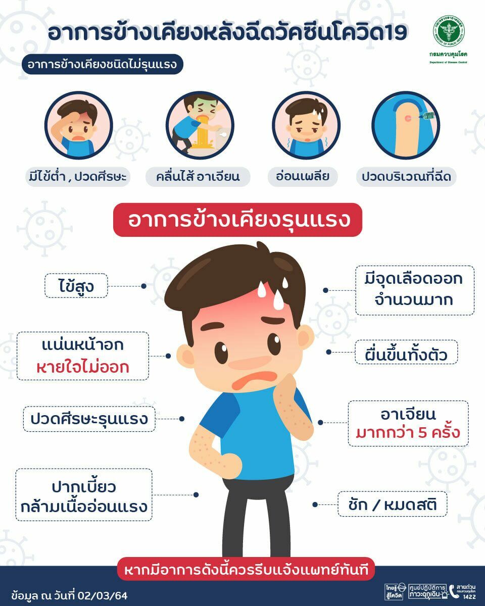 เพจ Facebook ไทยรู้สู้โควิด โดยกรมควบคุมโรค กระทรวงสาธารณสุข เผยแพร่อินโฟกราฟฟิค อาการข้างเคียง ของผู้ที่ได้รับ วัคซีนโควิด โดยแบ่งระดับได้ดังนี้