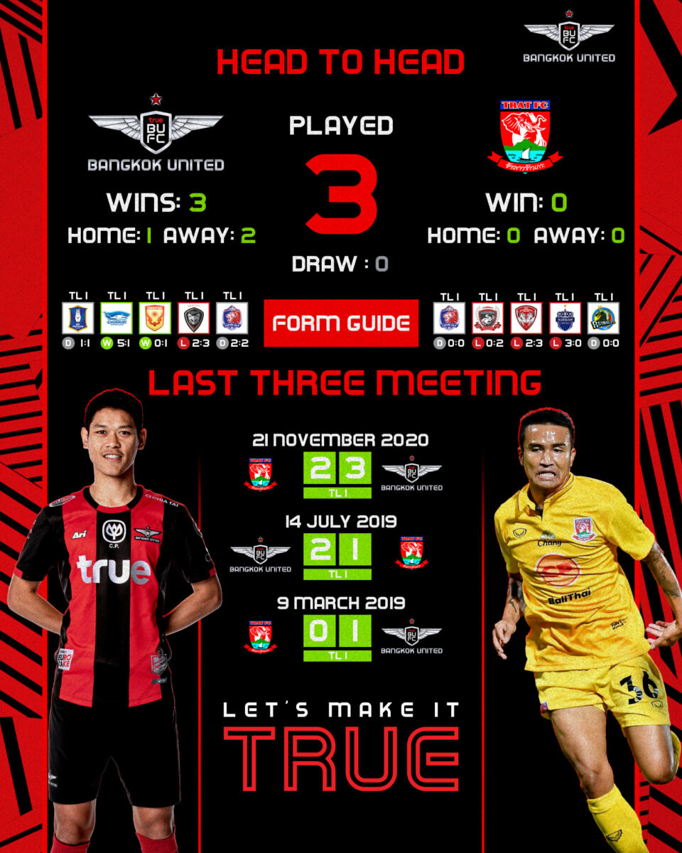 ทรู แบงค็อก ยูไนเต็ด เหนือกว่าในหลายๆด้าน แม้จะไม่ชนะมาสองนัด แต่ฟอร์มโดยรวมยังถือว่าดีกว่า แถมนัดนี้เล่นในบ้าน ส่วนตราดที่ผู้เล่นติดโทษแบนสองคน และอาจปรับรูปแบบเกมใหม่ แต่น่าจะต้านทานความแงของแบงค็อก ยูไนเต็ดไม่ได้