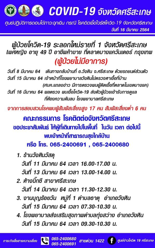 ที่มา: Facebook – ศูนย์ข่าวโควิด 19 ศรีสะเกษ