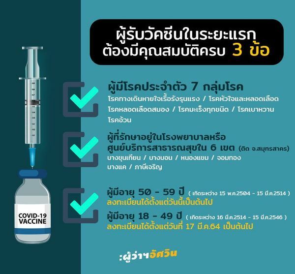 ซึ่งประชาชนกลุ่มเสี่ยงที่จะได้รับวัคซีน จะต้องมีคุณสมบัติครบ 3 ข้อ ดังนี้