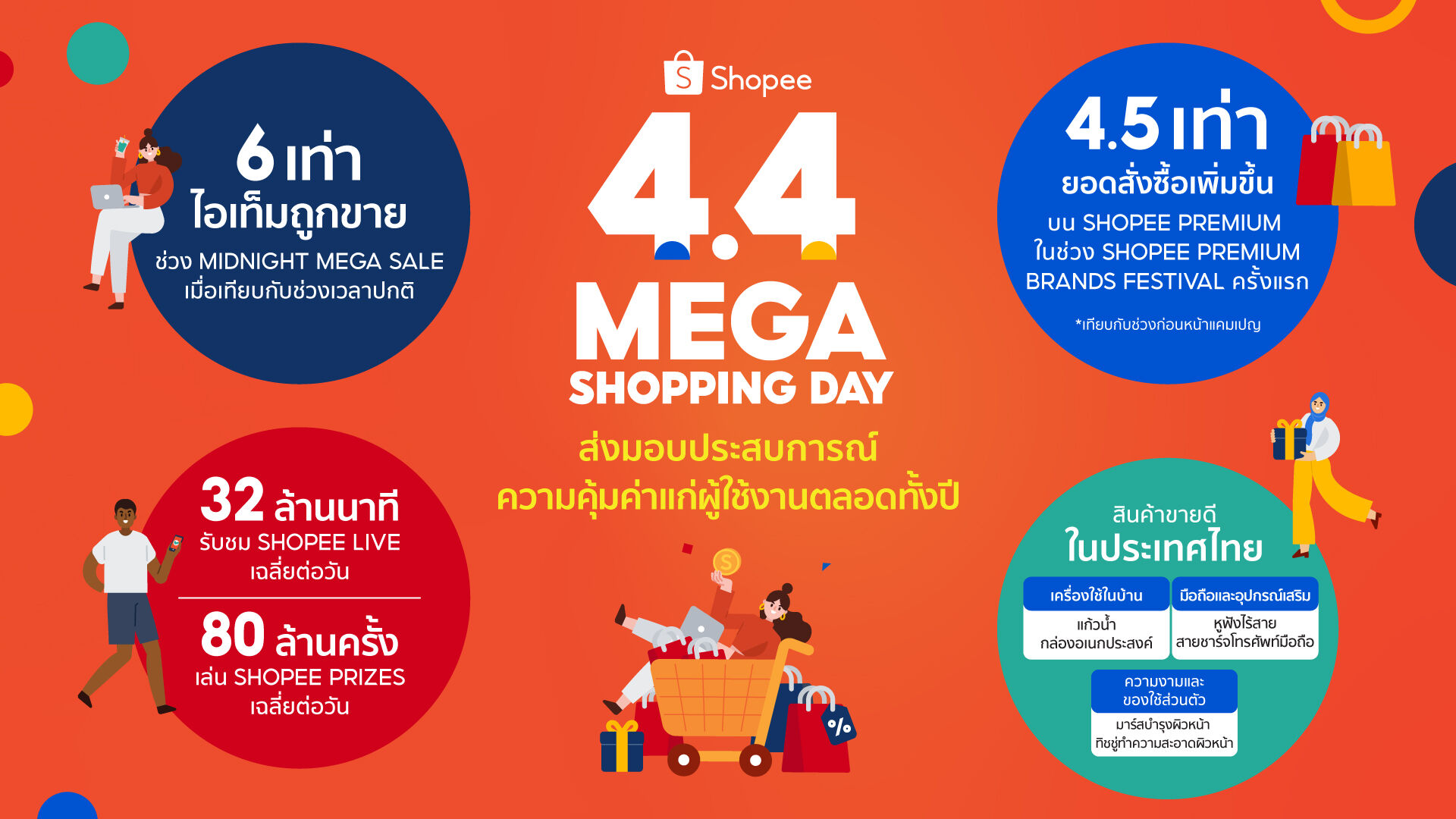 สำหรับประเทศไทย แคมเปญ Shopee 4.4 Mega Shopping Day ได้มอบความคุ้มค่าให้กับนักช้อปผ่านดีลเด็ดที่ไม่มีใครเทียบได้ด้วยแบรนด์และร้านค้าครอบคลุมทุกหมวดหมู่ อีกทั้งยังเป็นการตอบสนองนักช้อปชาวไทยสำหรับความต้องการด้านของใช้ส่วนตัวและเครื่องใช้ในบ้าน โดยหมวดหมู่สินค้าที่ได้รับความนิยมสูงสุดในช่วงวันที่ 4 เมษายน 2564 ได้แก่เครื่องใช้ในบ้าน ความงามและของใช้ส่วนตัว และมือถือและอุปกรณ์เสริม