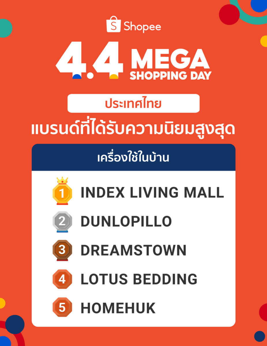 - เครื่องใช้ในบ้าน: นักช้อปซื้อสินค้าเพื่อตกแต่งพื้นที่ใช้สอย ในแคมเปญ Shopee 4.4 Mega Shopping Day โดยพบว่า วันที่ 4 เดือน 4 สินค้าสำหรับห้องครัวและห้องอาหาร เป็นสินค้าที่ิฮอตฮิตสำหรับนักช้อป โดยสินค้าถูกจำหน่ายออกไป 360,000 ชิ้นภายใน 24 ชั่วโมง และแบรนด์ที่ได้รับความนิยมสูง ได้แก่ Dunlopillo, Homehuk และ Index Living Mall อีกทั้งกลุ่มสินค้าที่ขายดีที่สุดได้แก่ แก้วน้ำ และ กล่องอเนกประสงค์