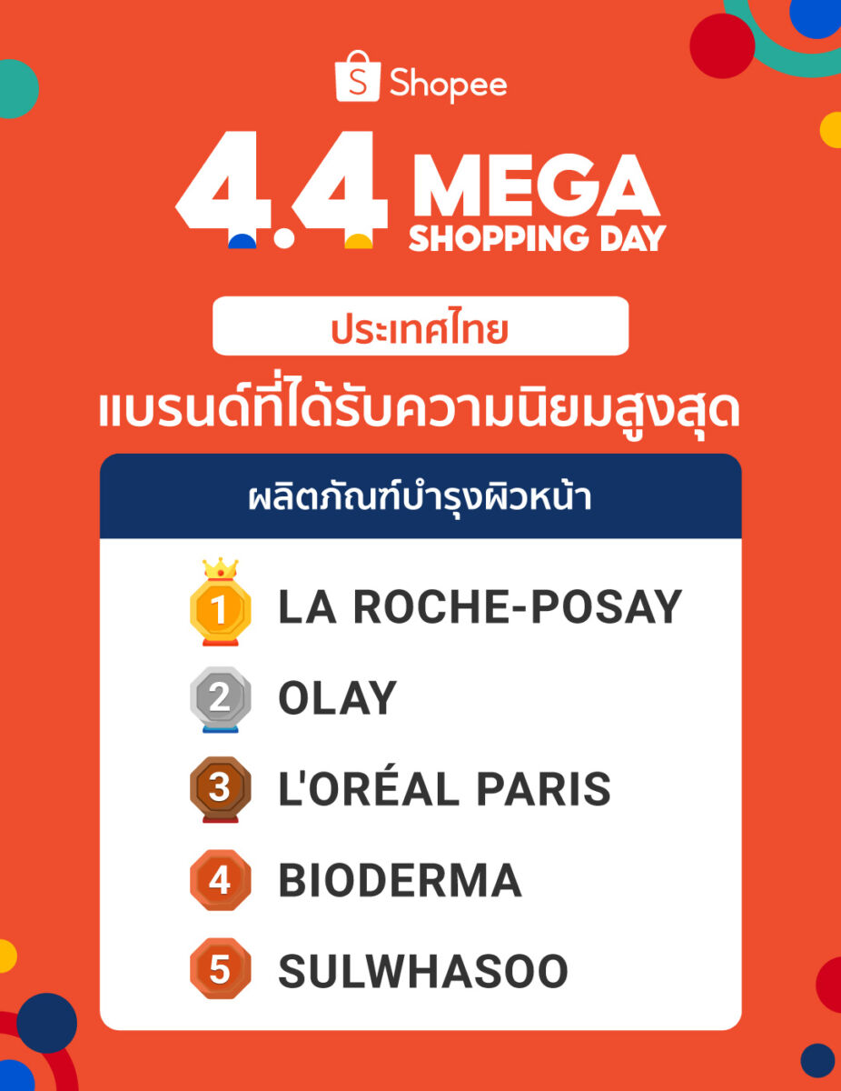 - ความงามและของใช้ส่วนตัว: นักช้อปชาวไทยยังคงให้ความสำคัญกับความสวยความงาม โดยในวันที่ 4 เดือน 4 พบว่าสินค้าประเภทผลิตภัณฑ์บำรุงผิวหน้าถูกขายออกไปมากกว่าครึ่งล้าน อาทิ มาส์กบำรุงผิวหน้า ทิชชู่ทำความสะอาดผิวหน้า ซึ่งถือเป็นสินค้าที่ได้รับความต้องการจากนักช้อปจำนวนมาก สำหรับแบรนด์ที่ได้รับความนิยมสูง ได้แก่ La Roche-Posay, L’Oreal Paris และ Olay