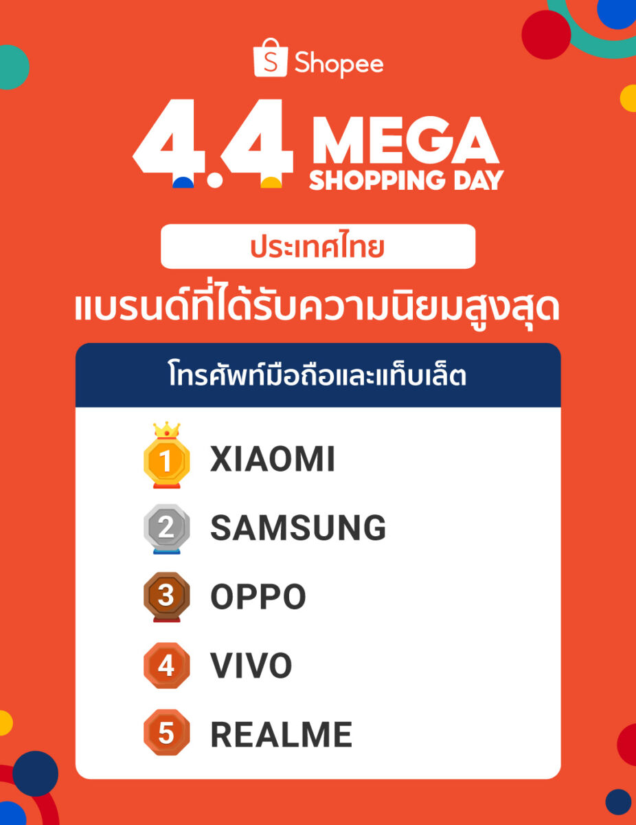 - มือถือและอุปกรณ์เสริม: ในช่วง Shopee 4.4 Mega Shopping Day ช้อปปี้ยังส่งสินค้าอิเล็กทรอนิกส์และอุปกรณ์เสริมให้กับนักช้อป โดยพบว่า หูฟังไร้สายและสายชาร์จโทรศัพท์มือถือได้รับความนิยมสูง และแบรนด์ที่ได้รับความนิยมสูงได้แก่ OPPO, Samsung และ Xiaomi