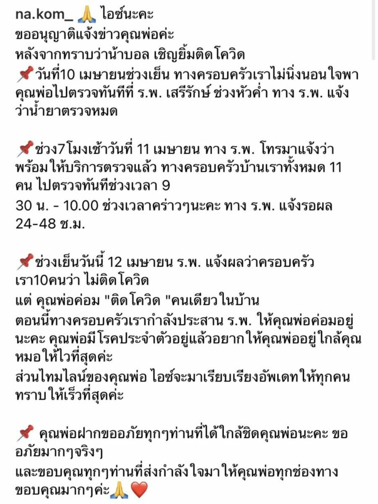 ไอซ์นะคะ ขออนุญาติแจ้งข่าวคุณพ่อค่ะ หลังจากทราบว่าน้าบอล เชิญยิ้มติดโควิด