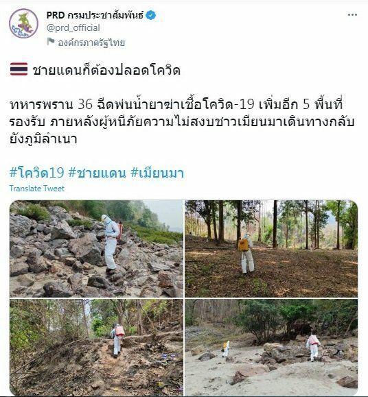 กรมประชาสัมพันธ์ ได้ทวีตข้อความลงทวิตเตอร์เพื่อประชาสัมพันธ์พร้อมเผยแพร่ภาพของ ทหารพราน 36 ฉีดพ่นน้ำยาฆ่าเชื้อโควิด-19 เพิ่มอีก 5 พื้นที่รองรับ ภายหลังผู้หนีภัยความไม่สงบชาวเมียนมาเดินทางกลับยังภูมิลำเนา เพื่อเป็นการป้องกันการแพร่ระบาดของโรคโควิด-19