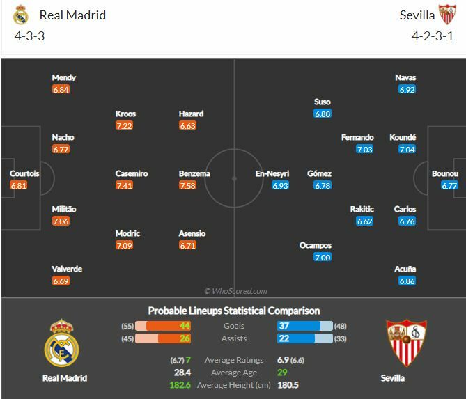 - ยูเลน โลเปเตกี ไม่มีปัญหาผู้เล่นบาดเจ็บหรือติดโทษแบนแต่อย่างใดทำให้สามารถจัดทัพใหญ่ลงสนามได้อย่างเต็มที่ ภายใต้ระบบ 4-2-3-1 นายทวาร ยาสซีน โบโน่, แผงแบ็กโฟร์ มี เฆซุส นาบาส กัปตันทีมยืนแบ็กขวา,แบ็กซ้ายเป็น มาร์กอส อากุนญ่า และคู่เซนเตอร์ฮาล์ฟใช้ จูลส์ กูงเด้ กับ ดีเอโก้ การ์ลอส ในแผงกลาง เเฟร์นานโด จะลงตัดเกมและคุมจังหวะร่วมกับ อีวาน ราคิติช ทำให้ โยน ฆอร์ดาน น่าจะหลุดไปนั่งสำรอง