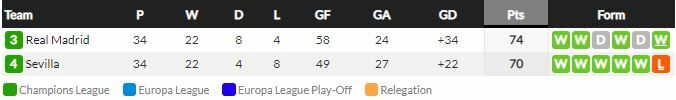 เรอัล มาดริด ต้องการชัยชนะนัดนี้เพื่อการเป็นจ่าฝูงแบบเดี่ยวๆให้ได้ เกมนี้ได้เปรียบเล็กน้อยจากการเล่นในบ้าน อย่างไรก็ตาม เซบีย่าก็มาสู้เต็มที่และหวังจะมีแต้มกลับไปให้ได้ แต่เชื่อว่าสุดท้ายแล้ว เรอัล มาดริด จะเน้นกว่าและเฉือนเอาชนะไปได้ในที่สุด