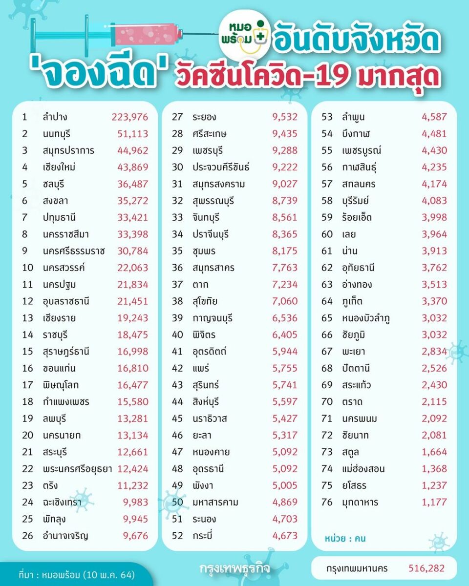 เพจเฟซบุ๊ก ไทยรู้สู้โควิด ได้เปิดเผยยอดการจองรับวัคซีนผ่านทางแอปพลิเคชั่น ‘หมอพร้อม’ สำหรับกลุ่มผู้มีอายุ 60 ปีขึ้นไปและผู้ป่วย 7 กลุ่มโรคเรื้อรัง ซึ่งเป็นข้อมูลประจำวันที่ 10 พ.ค. ที่ผ่านมา โดย 10 อันดับแรกได้แก่