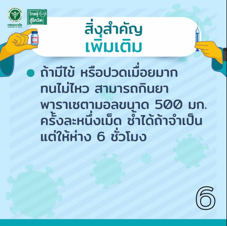ดังนั้นหากหลังรับวัคซีนแล้วมีอาการไข้ ปวด สามารถกินยาพาราเซตามอลได้ แต่หากมีอาการหนัก ให้พบแพทย์ทันที