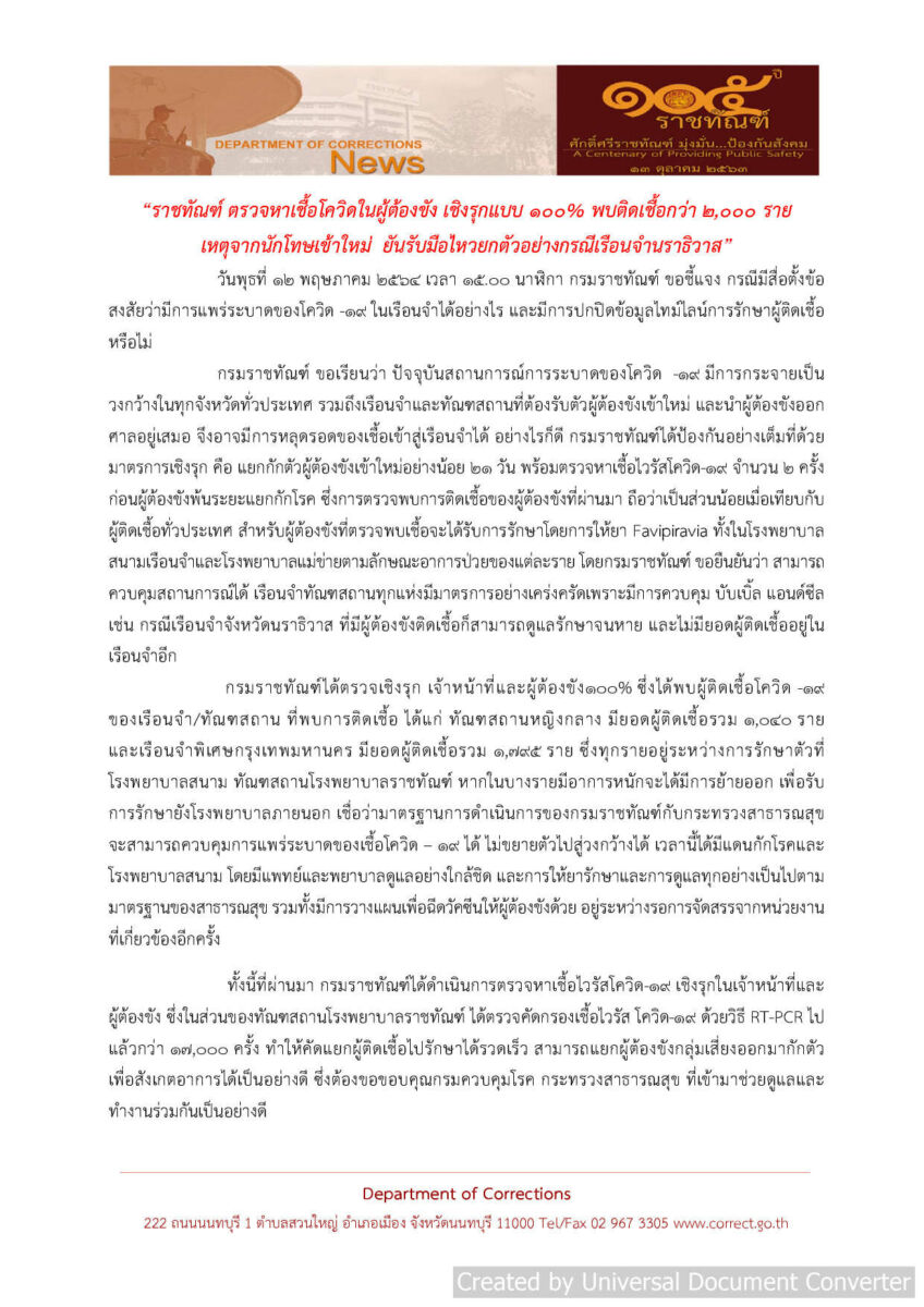 ทั้งนี้ที่ผ่านมา กรมราชทัณฑ์ได้ดำเนินการตรวจหาเชื้อไวรัสโควิด-19 เชิงรุกในเจ้าหน้าที่และผู้ต้องขัง ซึ่งในส่วนของทัณฑสถานโรงพยาบาลราชทัณฑ์ ได้ตรวจคัดกรองเชื้อไวรัส โควิด-19 ด้วยวิธี RT-PCR ไปแล้วกว่า 17,000 ครั้ง ทำให้คัดแยกผู้ติดเชื้อไปรักษาได้รวดเร็ว สามารถแยกผู้ต้องขังกลุ่มเสี่ยงออกมากักตัว เพื่อสังเกตอาการได้เป็นอย่างดี ซึ่งต้องขอขอบคุณกรมควบคุมโรค กระทรวงสาธารณสุข ที่เข้ามาช่วยดูแลและทำงานร่วมกันเป็นอย่างดี