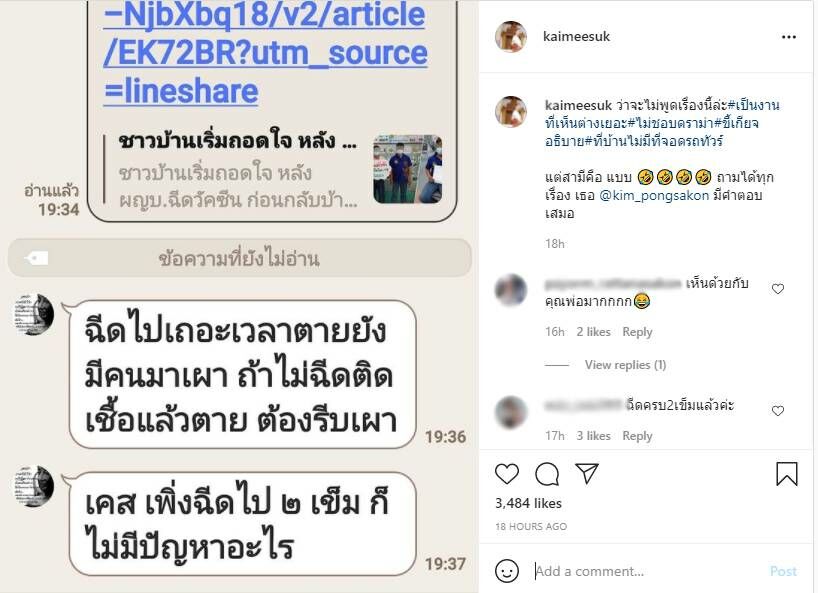 ล่าสุดในวันที่ 19 พ.ค. ที่ผ่านมา อดีตผู้ประกาศข่าวอย่างคุณ ไก่ มีสุข ได้ออกมาโพสท์ภาพข้อความที่คุยกับคุณสามี คิม พงศกร ในเรื่องของการฉีดวัคซีนโควิด-19 เช่นเดียวกัน