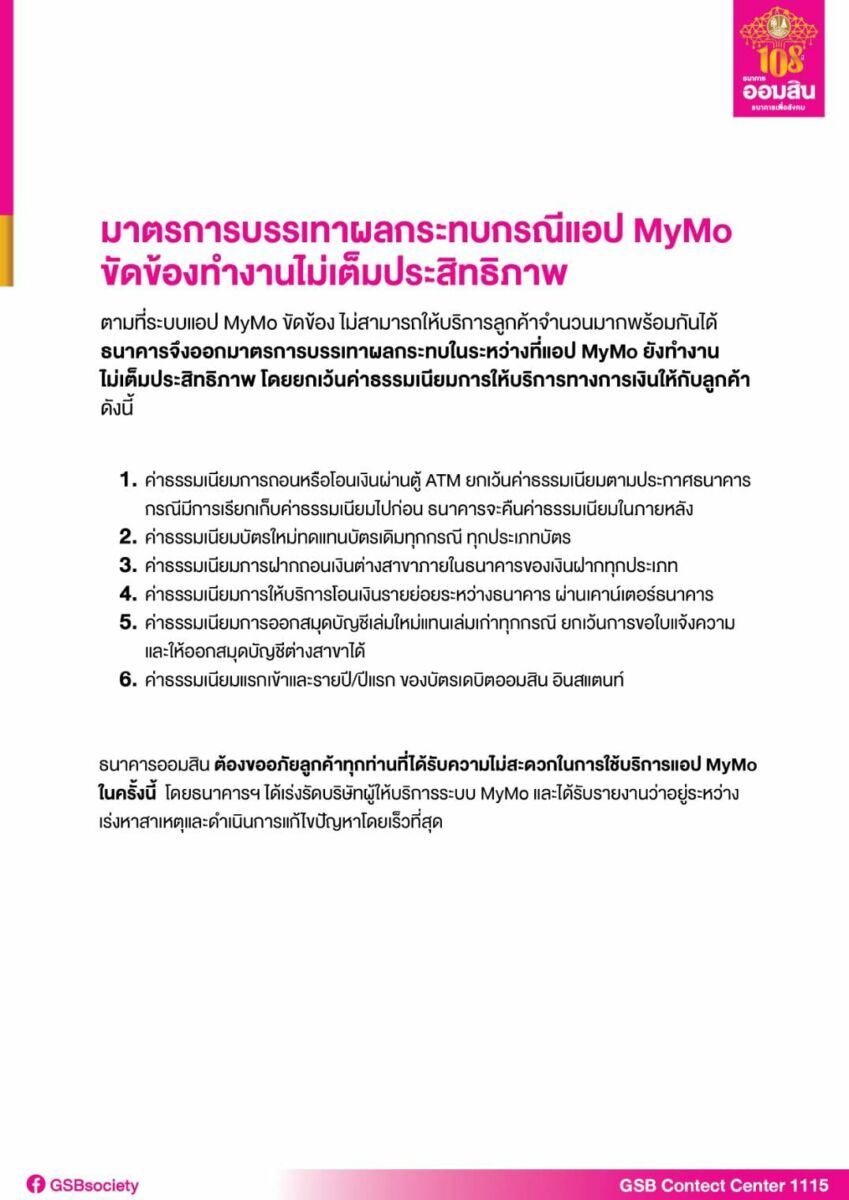 สืบเนื่องจากกรณีแอปพลิเคชั่นของธนาคารออมสิน หรือ Mymo ขัดข้อง ไม่สามารถใช้งานได้ในหลายพื้นที่ และธนาคารออมสินได้ออกมาชี้แจงและอธิบายว่ากำลังแก้ไขนั้น