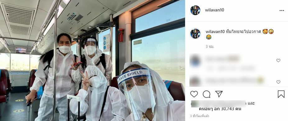 โดยเมื่อถึงกาตาร์ ไอจีของ กัปตันกิ๊ฟ วิลาวัณย์ อภิญญาพงศ์ wilavan10 ได้อัปเดตภาพร่วมกับเพื่อน ๆ อรอุมา สิทธิรักษ์ และปลื้มจิตร ถินขาว ในชุด PPE ป้องกันเชื้อโควิดอย่างเต็มที่ ไม่ประมาท แม้ว่านักกีฬาและทีมงานทุกคนจะได้ฉีดวัคซีนป้องกันโควิดก่อนออกเดินทางแล้วก็ตาม