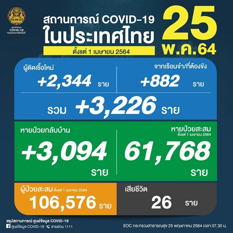โควิดไทยวันนี้ ติดเชื้อเพิ่ม 3,266 ราย ดับ 26 ศพ
