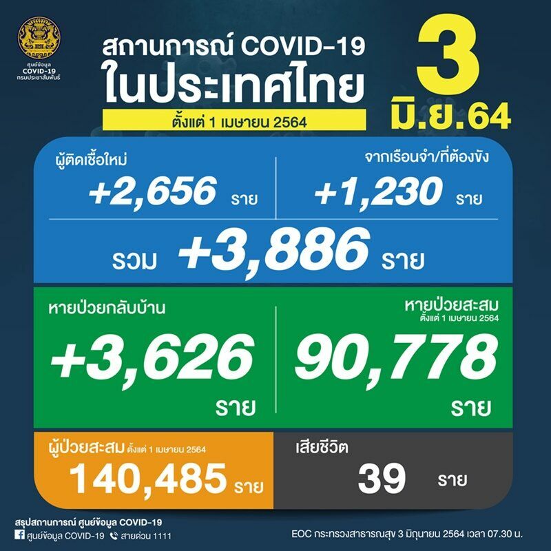 โควิดไทยวันนี้ ติดเชื้อเพิ่ม 3,886 ราย ดับ 39 ศพ