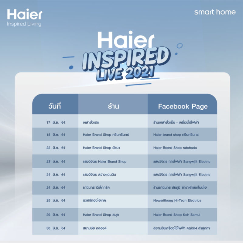 ชมและช้อปเครื่องใช้ไฟฟ้าคุณภาพดี ราคาพิเศษ พร้อมลุ้นรับรางวัลมากมาย ติดตามรายละเอียดตารางการ Live ของร้านค้าตัวแทนจำหน่ายและไฮเออร์แบรนด์ช็อปที่ร่วมรายการได้ที่เฟซบุ๊ค : HaierThailand