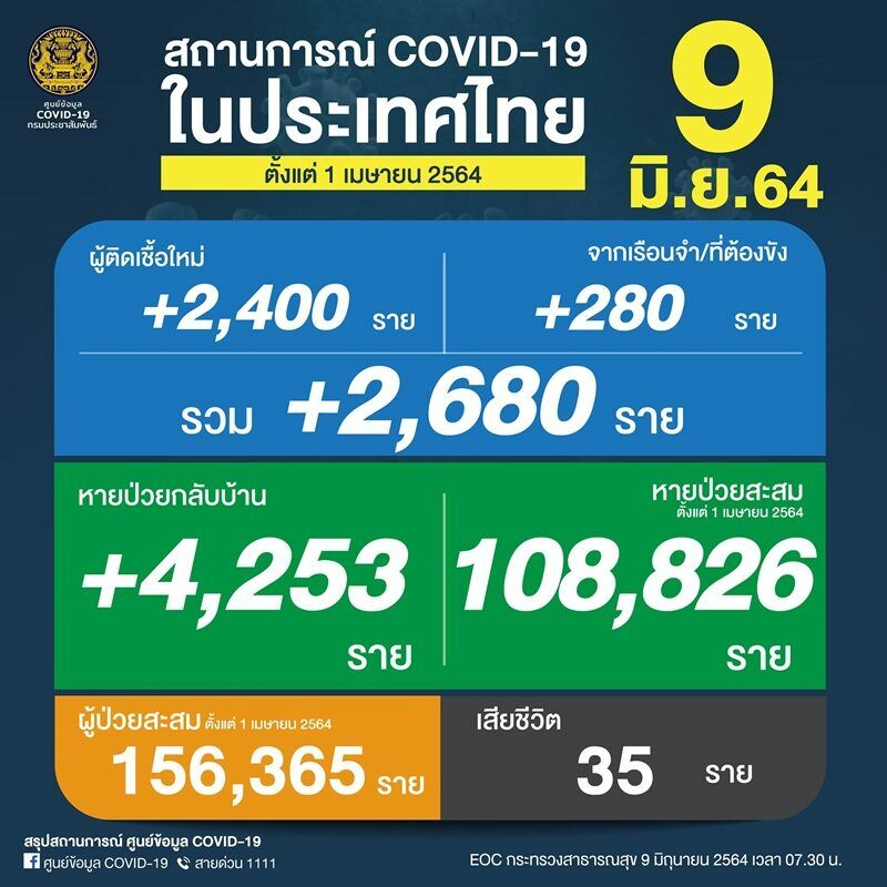 โควิดไทยวันนี้ ติดเชื้อเพิ่ม 2,680 ราย ดับ 35 ศพ