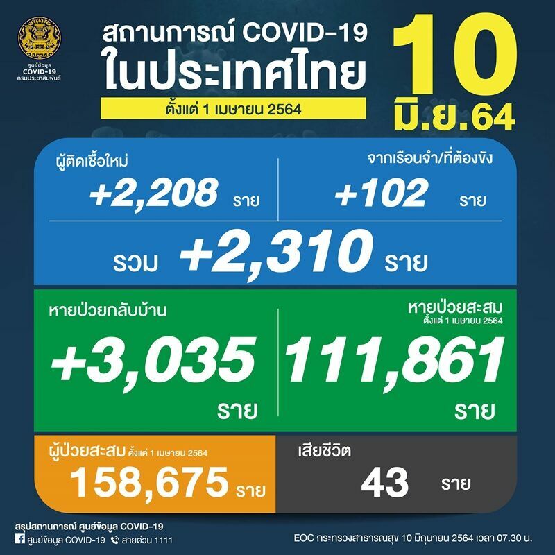 โควิดไทย ผู้ติดเชื้อวันนี้ – ศูนย์ปฏิบัติการฉุกเฉิน กรมควบคุมโรค ได้เผยแพร่ตัวเลขสถานการณ์ผู้ติดเชื้อโควิด ประจำวันที่ 10 มิถุนายน ว่ามีผู้ป่วยจำนวน 2,310 ราย โดยในจำนวนดังกล่าวเป็นผู้ติดเชื้อจากเรือนจำ 102 ราย ขณะที่มีผู้ป่วยกลับบ้านเพิ่ม 3,085 ราย และมียอดผู้ป่วยสะสมตั้งแต่ช่วงเมษายน อยู่ที่ 158,675 ราย