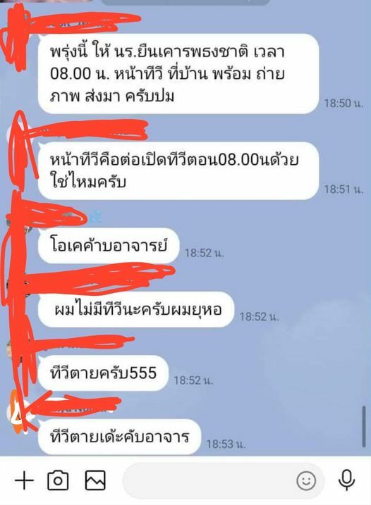 8 มิ.ย. 64 – คุณครูวิทยาลัยฯ แห่งหนึ่งในอุบลราชธานี แชทไลน์บอกลูกศิษ์ ยืนเคารพธงชาติหน้าทีวี เวลา 08.00 น. แล้วถ่ายรูปส่งครูทุกวัน