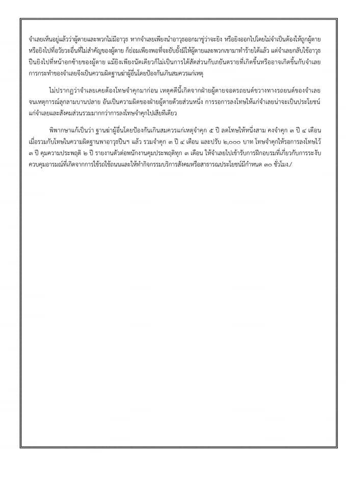 ซึ่งจากที่ศาลฎีกา ตรวจสำนวนประชุมปรึกษาหารือกันแล้ว เหตุคดีนี้เกิดจากฝ่ายผู้ตายจอดรถยนต์ขวางทางรถยนต์ของจำเลย จนเหตุการณ์ลุกลามบานปลาย อันเป็นความผิดของฝ่ายผู้ตายด้วยส่วนหนึ่ง การรอการลงโทษให้แก่จำเลยน่าจะเป็นประโยชน์ แก่จำเลยและสังคมส่วนรวมมากกว่าการลงโทษจำคุกไปเสียทีเดียว