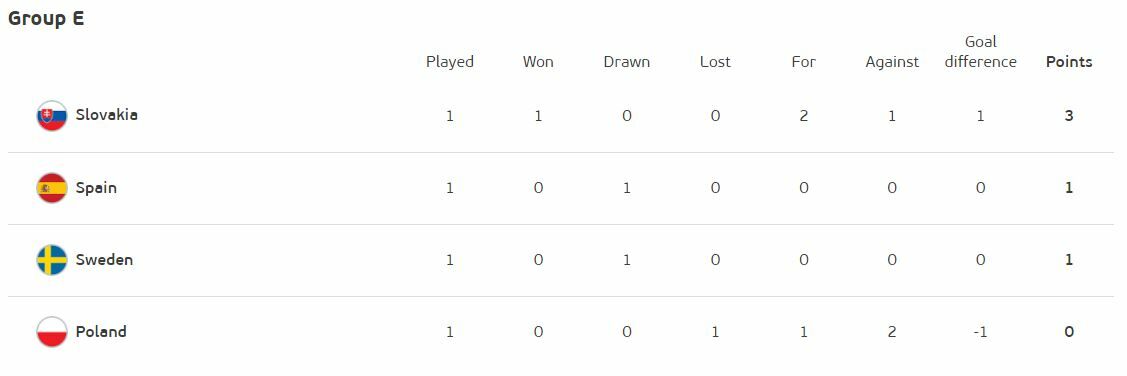 - สโลวาเกีย ของ สเตฟาน ทาร์โควิช ประเดิมคว้า 3 แต้มด้วยการพลิกชนะ โปแลนด์ 2-1 เป้าหมายนัดนี้ขอแค่แต้มเดียวก็แทบการันตีเข้ารอบ 16 ทีมสุดท้าย