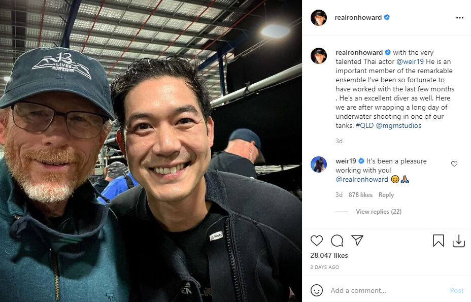 เวียร์ขอบคุณรอนฮาเวิร์ด – หลังจากที่มีข่าวของพระเอกหนุ่ม ‘เวียร์ ศุกลวัฒน์ คณารศ’ ได้ขึ้นแท่นเป็นหนึ่งในนักแสดงหนังเรื่อง ‘Thirteen Lives’ หนังที่ถูกอิงมาจากเรื่องราวของโค้ชและทีมฟุตบอลหมูป่า 13 คน ที่ติดอยู่ในถ้ำหลวง ขุนน้ำนางนอน จังหวัดเชียงราย ซึ่งเวียร์จะเข้ามารับบท ‘จ่าแซม’ วีรบุรุษผู้ล่วงลับที่ช่วยให้เด็กทั้ง 13 คน ออกมาจากถ้ำ โดยได้ผู้กำกับชื่อดังระดับฮอลลีวูดอย่าง ‘รอน ฮาเวิร์ด (Ron Howard)’ จาก ‘Solo: A Star Wars Story’ มาขึ้นแท่นกำกับ