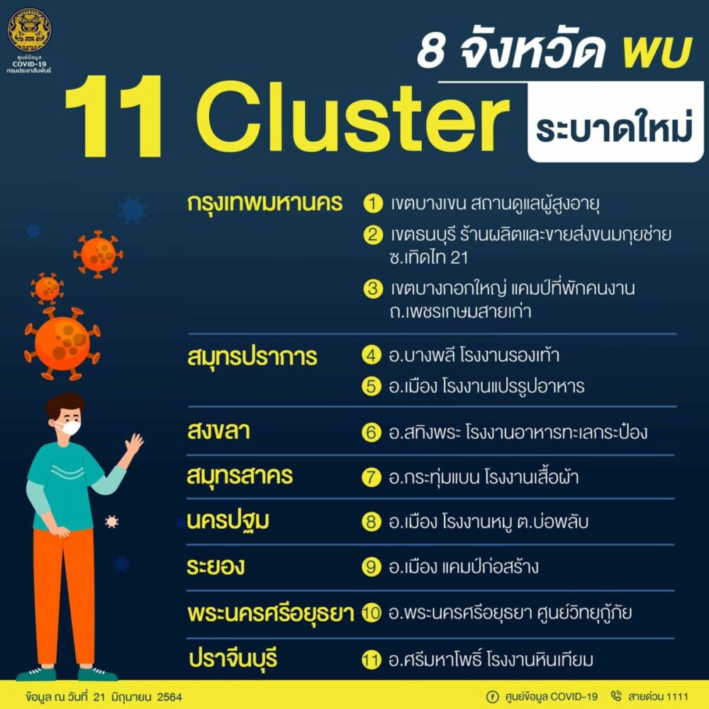 ล่าสุดนี้ ได้มีการรายงานถึงการพบ คลัสเตอร์โควิด-19 แห่งใหม่ จำนวน 11 จุด กระจายไปทั่วประเทศไทยใน 8 จังหวัด – กทม. 3 แห่ง, ตจว. 8 แห่ง