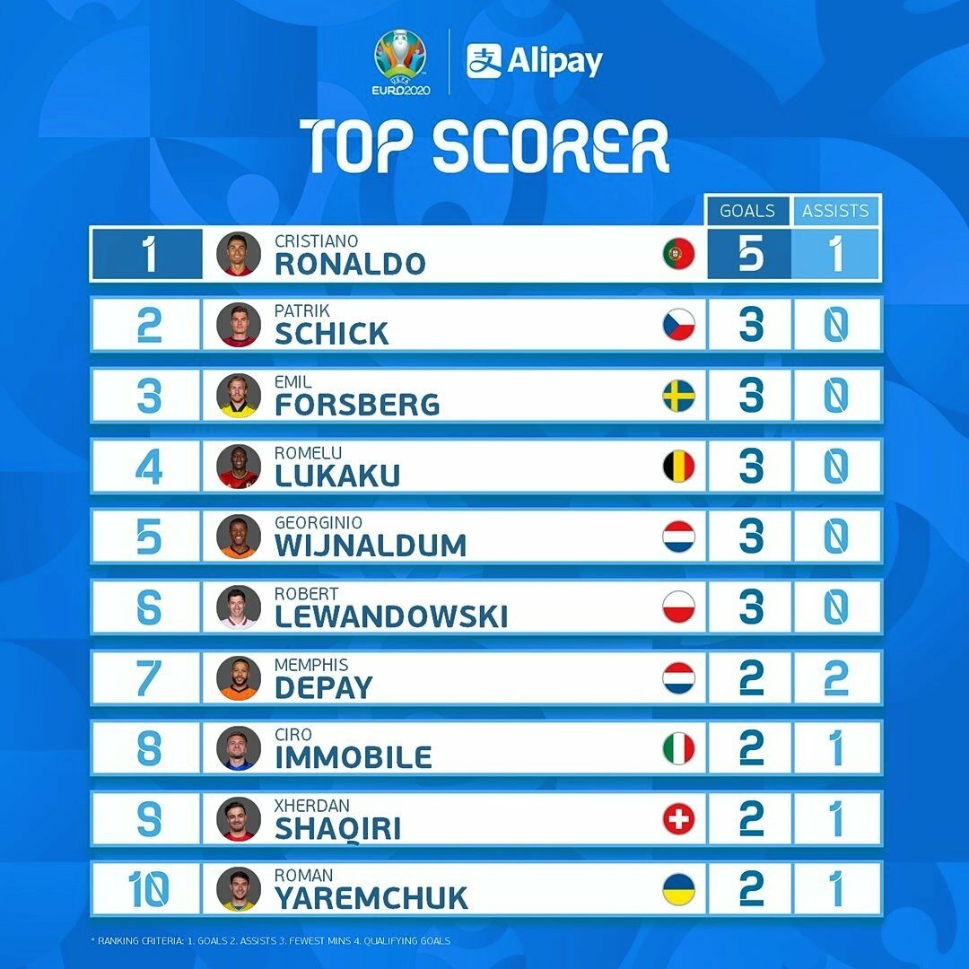 ซึ่งตอนนี้ คริสเตียโน่ โรนัลโด้ ยังคงนำเป็นดาวซัลโวอยู่ด้วยการทำไป 5 ประตู ส่วนคนที่ตามมานั้นก็ทำไปคนละ 3 ประตู ไม่ว่าจะเป็น เอมิล ฟอร์สเบิร์ก (สวีเดน), แพทริค ชิค (เช็ก), โรเมลู ลูกากู (เบลเยียม), จอร์จินโย่ ไวจ์นัลดุม (ฮอลแลนด์) และ โรเบิร์ต เลวานดอฟสกี้ (โปแลนด์) โดยตอนนี้มีแค่ เลวานดอฟสกี้ คนเดียวเท่านั้นที่หมดลุ้นเนื่องจากโปแลนด์ตกรอบไปเรียบร้อยแล้ว