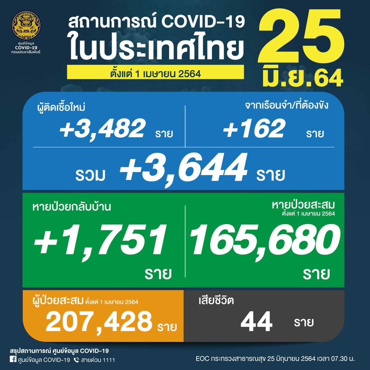 โควิดไทย ผู้ติดเชื้อวันนี้ – ศูนย์ปฏิบัติการฉุกเฉิน กรมควบคุมโรค ได้เผยแพร่ตัวเลขสถานการณ์ผู้ติดเชื้อโควิด ประจำวันที่ 25 มิถุนายน ว่ามีผู้ป่วยจำนวน 3,644 ราย โดยในจำนวนดังกล่าวเป็นผู้ติดเชื้อจากเรือนจำ 162 ราย ขณะที่มีผู้ป่วยกลับบ้านเพิ่ม 1,751 ราย และมียอดผู้ป่วยสะสมตั้งแต่ช่วงเมษายน อยู่ที่ 207,428 ราย