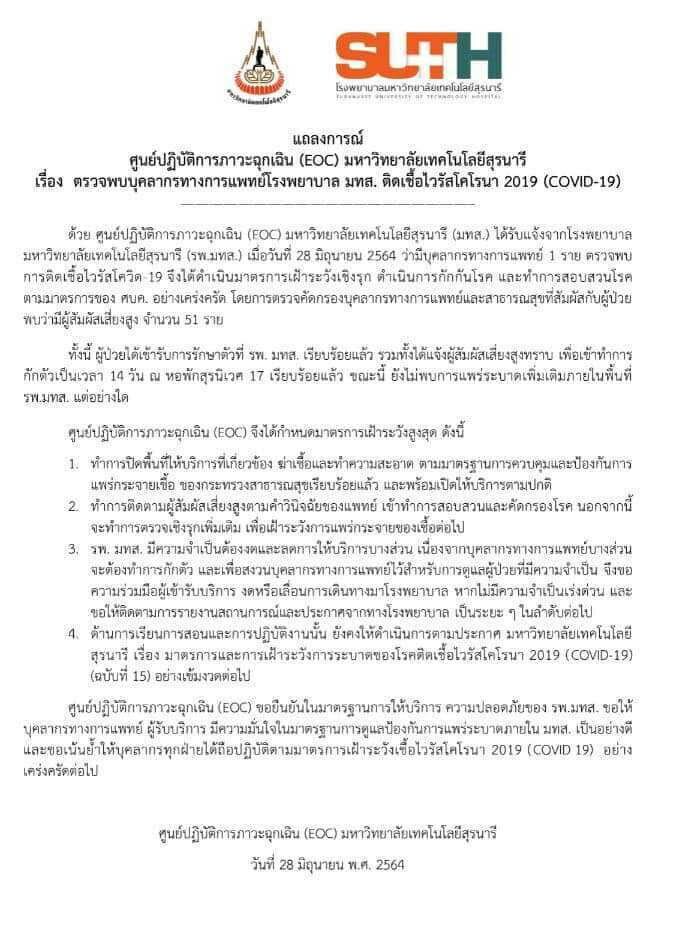 ศูนย์ปฏิบัติการภาวะฉุกเฉิน (EOC) มหาวิทยาลัยเทคโนโลยีสุรนารี (มทส.) ได้รับแจ้งจากโรงพยาบาลมหาวิทยาลัยเทคโนโลยีสุรนารี (รพ.มทส.) เมื่อวันที่ 28 มิ.ย. 64 ว่ามีบุคลากรทางการแพทย์ 1 คน ตรวจพบการติดเชื้อไวรัสโควิด-19 จึงได้ดำเนินมาตรการเฝ้าระวังเชิงรุก ดำเนินการกักกันโรค และทำการสอบสวนโรคตามมาตรการของ ศบค. อย่างเคร่งครัด โดยการตรวจคัดกรองบุคลากรทางการแพทย์และสาธารณสุขที่สัมผัสกับผู้ป่วย พบว่ามีผู้สัมผัสเสี่ยงสูง จำนวน 51 คน