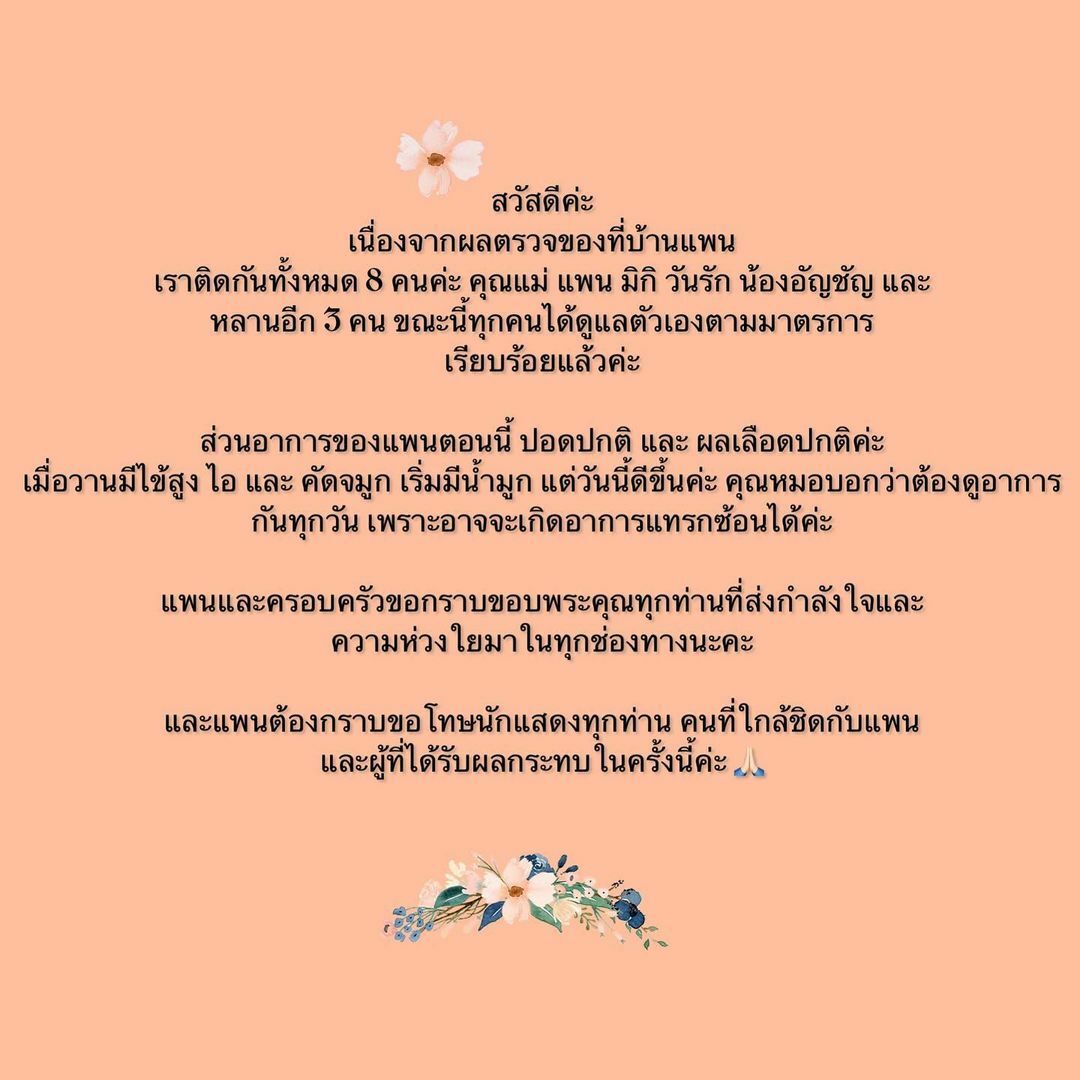 “สวัสดีค่ะ เนื่องจากผลตรวจของที่บ้านแพน เราติดกันทั้งหมด 8 คนค่ะ คุณแม่ แพน มิกิ วันรัก น้องอัญชัญ และ หลานอีก 3 คน ขณะนี้ทุกคนได้ดูแลตัวเองตามมาตรการเรียบร้อยแล้วค่ะ ส่วนอาการของแพนตอนนี้ ปอดปกติ และ ผลเลือดปกติค่ะ เมื่อวานมีไข้สูง ไอ และ คัดจมูก เริ่มมีน้ำมูก แต่วันนี้ดีขึ้นค่ะ คุณหมอบอกว่าต้องดูอาการกันทุกวัน เพราะอาจจะเกิดอาการแทรกซ้อนได้ค่ะ แพนและครอบครัวขอกราบขอบพระคุณทุกท่านที่ส่งกำลังใจและความห่วงใยมาในทุกช่องทางนะคะ และแพนต้องกราบขอโทษนักแสดงทุกท่าน คูนที่ใกล้ชิดกับแพน และผู้ที่ได้รับผลกระทบในครั้งนี้ค่ะ”