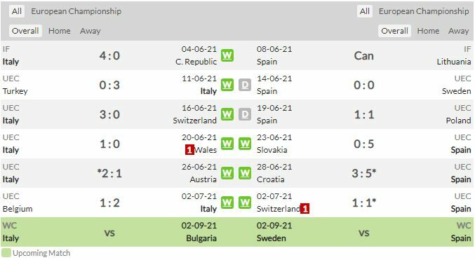 - อิตาลีลงเล่นในฐานะเจ้าบ้านพบกับสเปนและไม่แพ้มาแล้วใน 8 นัดหลังสุด (ทุกรายการ)