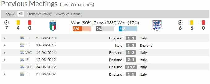 - ทั้ง 2 ทีมเจอกันมาทั้งหมด 27 ครั้ง และเป็นอิตาลีชนะได้ 11 ครั้ง ส่วนอังกฤษชนะไป 8 ครั้ง และเสมอกันไป 8 ครั้ง