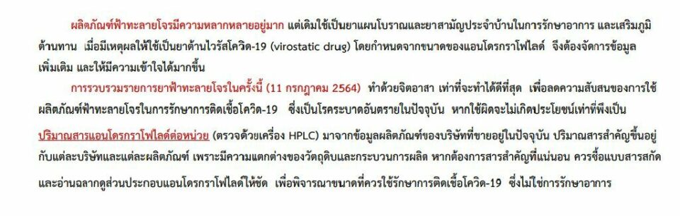 ล่าสุดนี้ ทางเพจเฟซบุ๊ค Drama-Addict ได้นำเสนอข้อมูล/รายละเอียดต่าง ๆ ของ ยาฟ้าทะลายโจร ที่สำหรับรักษาอาการจากโควิด-19 ในเบื้องต้นเบื้องต้น