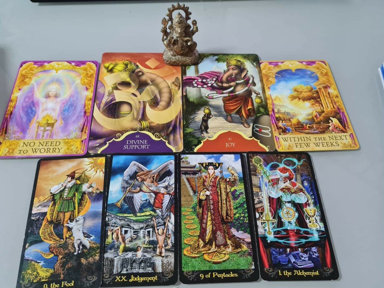 ภาพของการเริ่มต้น ไปพร้อมกับเพื่อนคู่ใจ เหมือนกับสารของพระพิฆเนศ ไปพ้อมกับหนูคู่ใจ ย้ำเตือนว่าคุณมีสิ่งศักดิ์สิทธิ์อยู่กับคุณ การพิพากษาของวระกรรมแต่ละคนมาถึงแล้ว สิ่งที่ถูกปกปิดอยู่จะถูกเปิดเผย สิ่งใดไร้ค่า อย่าให้ความสนใจ ภาพหญิงสาวเดินอยู่บนเหรียญ บอกถึงความร่ำรวยที่เบื้องบนรู้ว่าคุณต้องการในขณะนี้ นอกจากนี้ การสวดมนต์ภาวนา บวกกับการอธิษฐานจะช่วยให้คุณสื่อกับเบื้องบนได้เร็วขึ้น ลองดูค่ะ 2-3 สัปดาห์นับจากวันที่อ่านสารนี้??