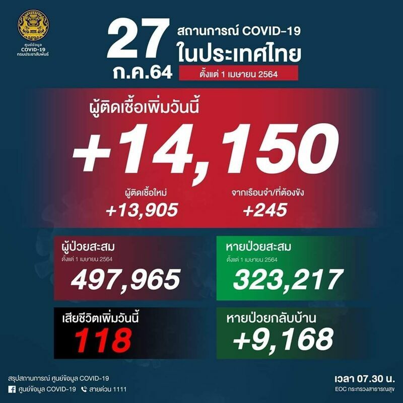 โควิดไทยวันนี้ ติดเชื้อเพิ่ม 14,150 ราย ดับ 118 ศพ